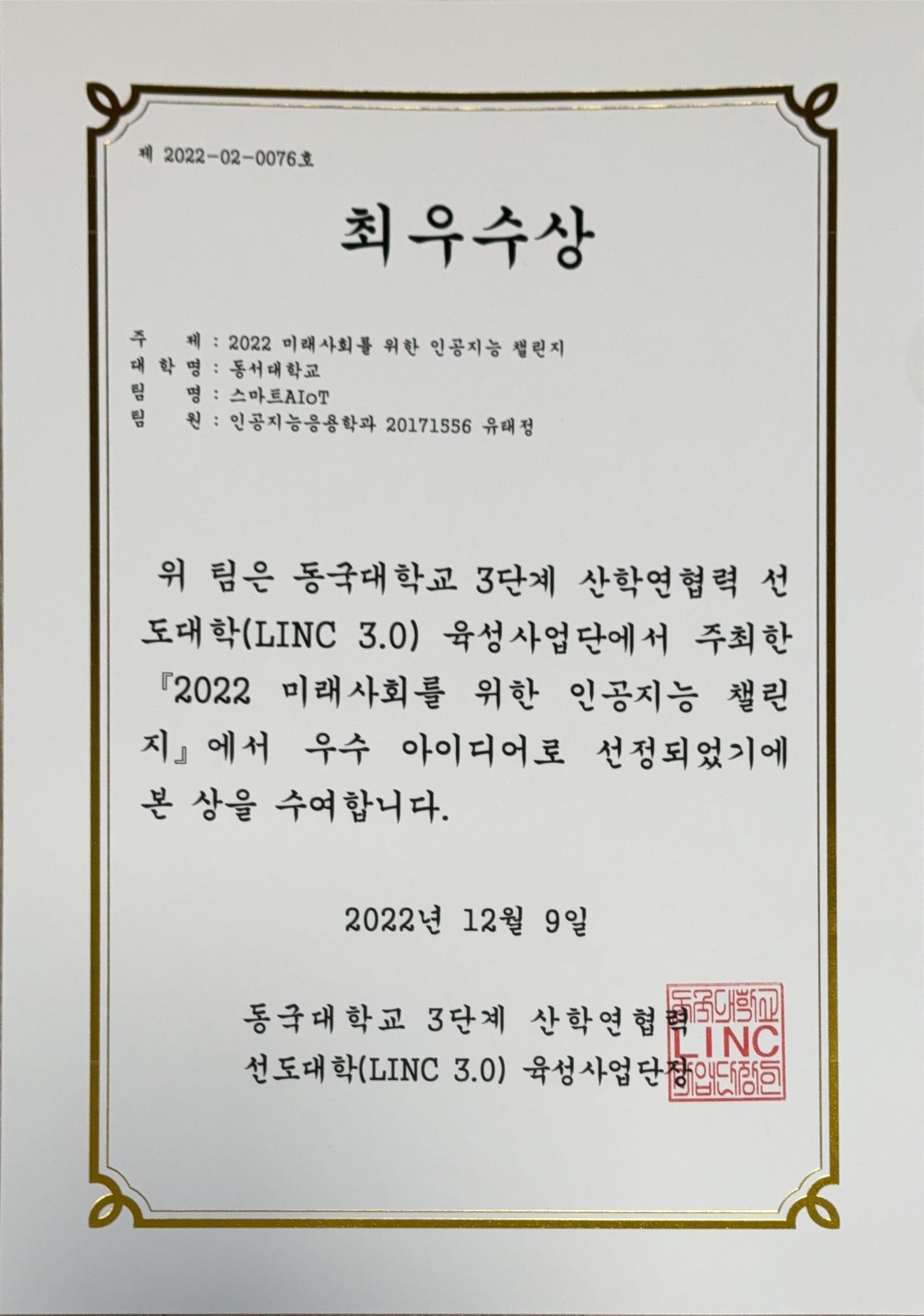 - 2022 미래사회를 위한 인공지능 챌린지 최우수상