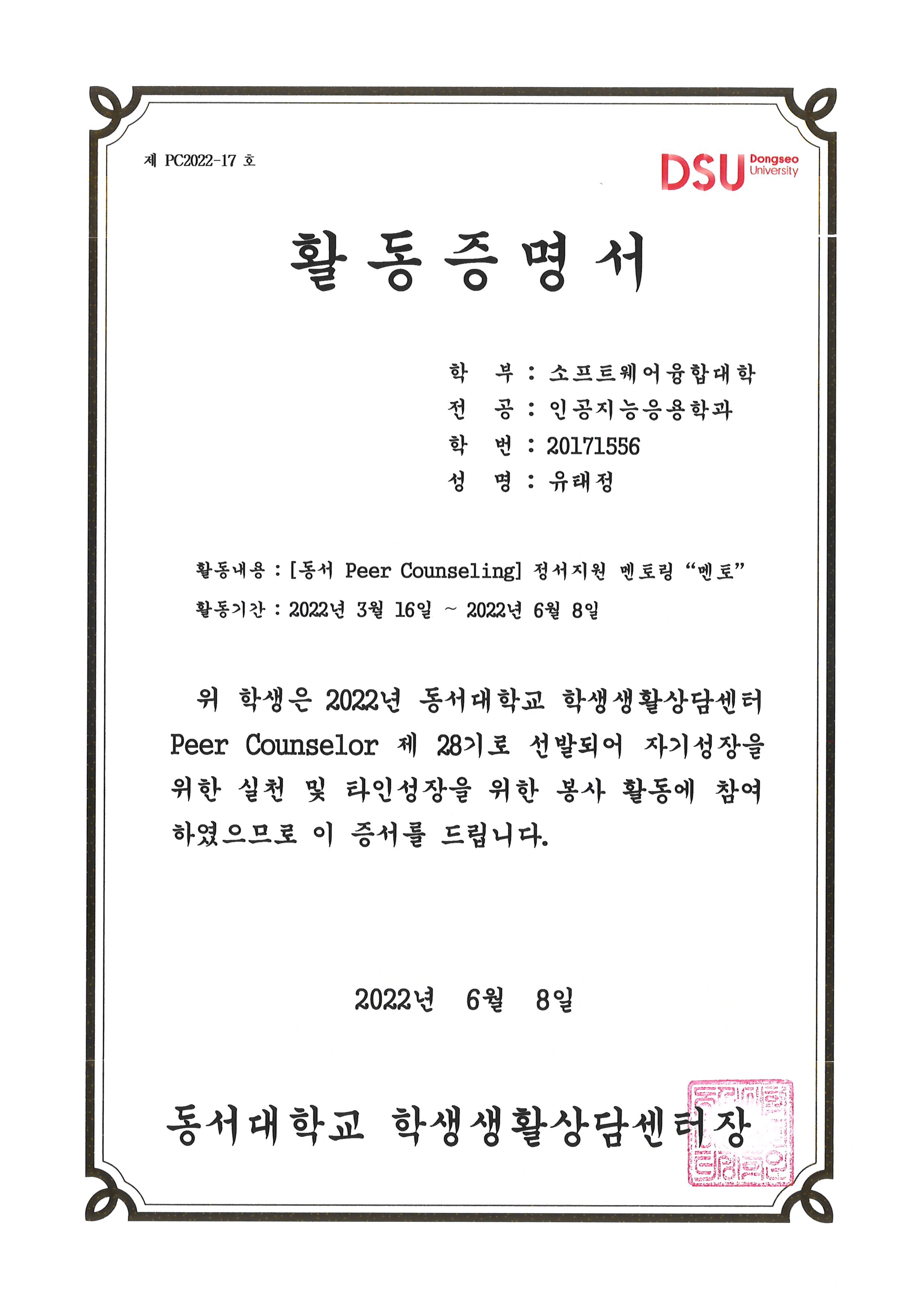 피어카운셀링 활동을 통하여 매칭된 멘티와 함께 공부하며 밥도 먹고 프로젝트도 진행하였다. 멘티는 학업 중에 힘들었던 점들을 말을 하면서 나에게 어려웠던 점들을 물어보았다. 나는 멘티의 평소 소심했던 성격을 알고 있었고, 사람들은 소심한 성격일수록 다가가기 어려워한다. 너의 의견을 좀 더 적극적으로 말을 하면 좋을 것 같다 라는 해결책을 제시하였고 멘티는 적극적인 성격으로 변화되었다.